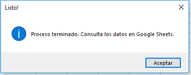 MsgBox “Proceso terminado. Consulta los datos en Google Sheets.”, vbInformation, “Listo!”