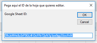 - Cuando des click en “Enviar datos”, aparece una ventana preguntando por el ID de la hoja a donde quieres llevar la información. Asegúrate de tener los permisos necesarios para editar la hoja a donde llegará la información (edición).