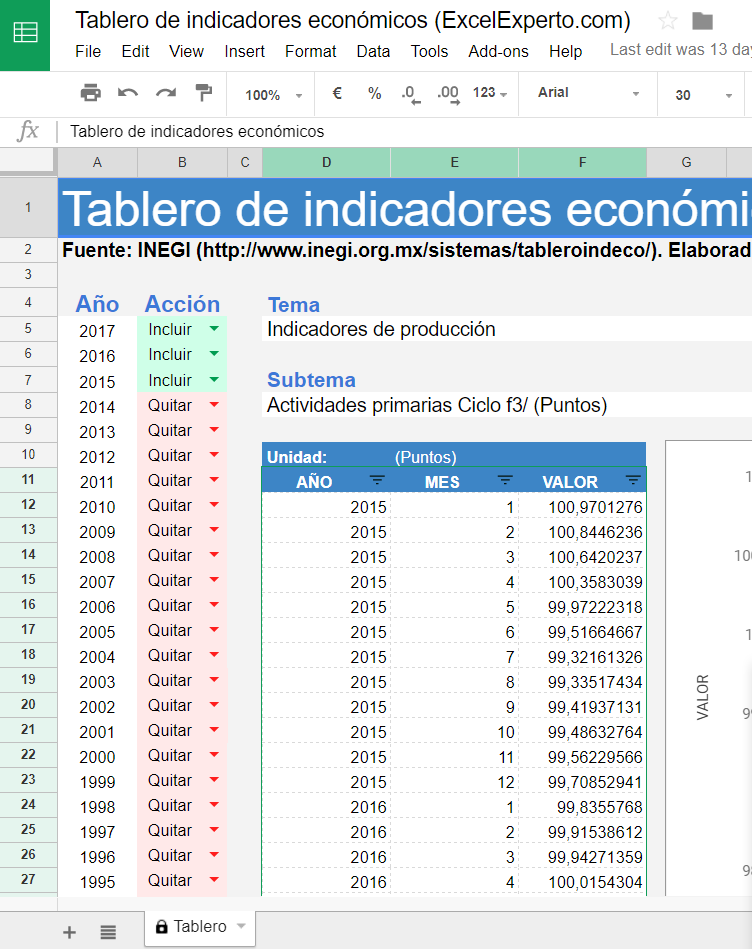 Con datos del Banco de Información Económica, se construyó este tablero que incluye Tablero de indicadores económicos. Los datos de origen los puedes descargar directamente de INEGI (ir a la fuente). ¿Quieres una copia? Manda tu email (solo #gmail) a info@fditf.com Disfruta #GoogleSheets.
